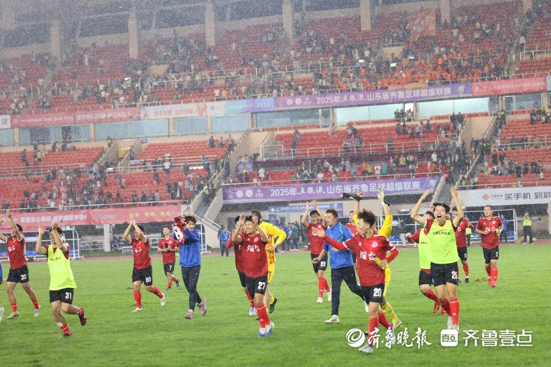 比赛获胜后,烟台队球员在球场上欢呼庆祝。