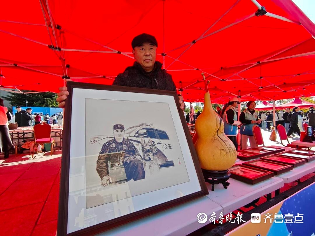 一旁,烟台烙画传承人陈亮带来的木板烙画《缉私风采》同样引人注目。“这幅描绘缉私警察与警犬的作品,花了五六天完成。”他表示,希望通过烙画的独特质感,让缉私民警的形象更加深入人心。