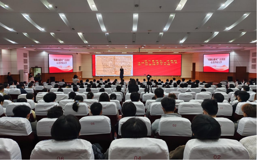 仪式结束后,“英雄山薪火”宣讲团为济南大学师生送上一场感人至深的红色宣讲,声情并茂地讲述了《勋章》《你好,馨华同志》《豫鲁山河间的血色纽带》等红色故事,生动诠释了革命先辈如山的信仰、如火的初心与不屈的气节,深深打动了在场每一位师生,现场反响热烈。