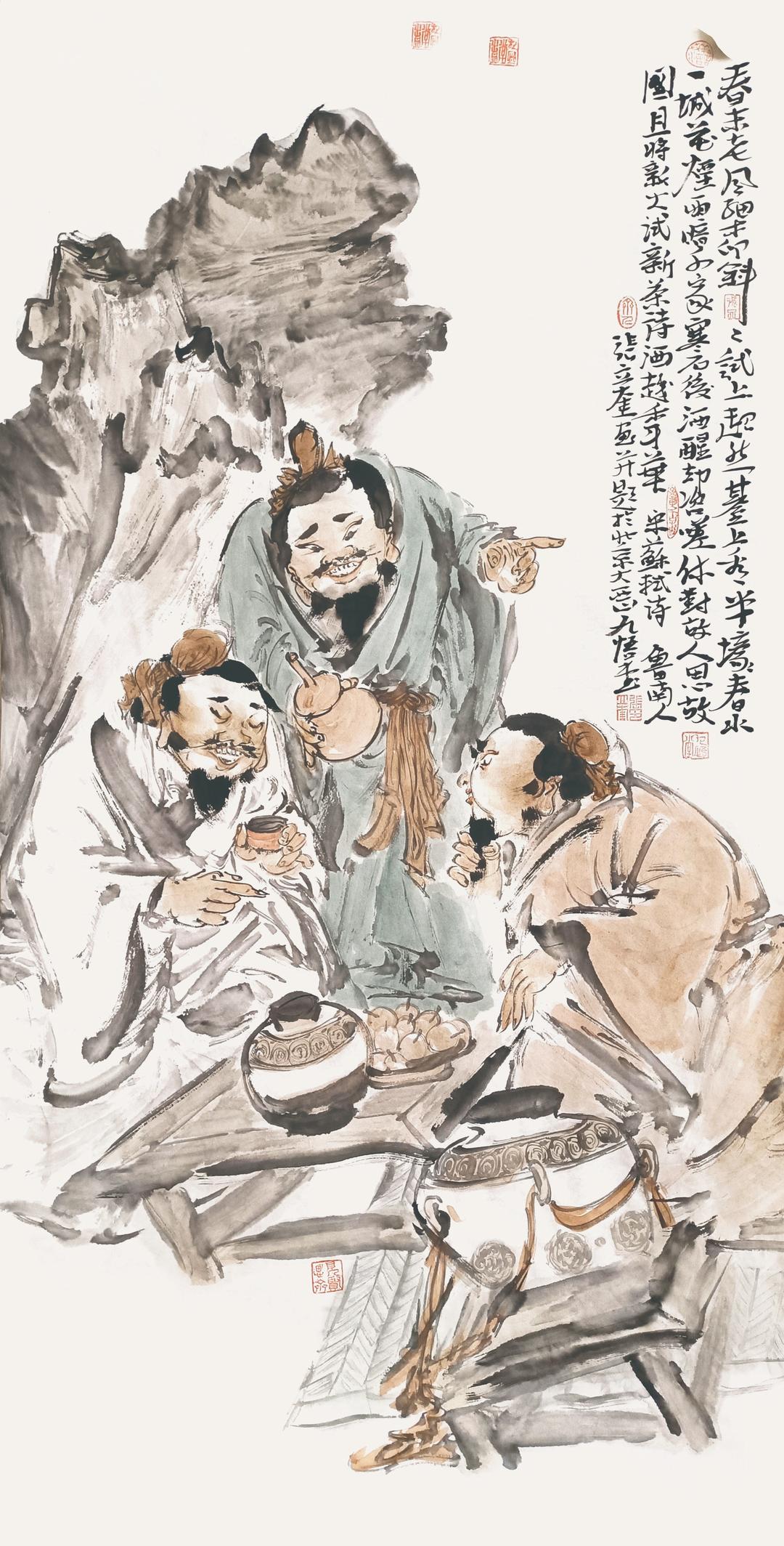 张立奎,毕业于解放军艺术学院,后又毕业于中央美术学院中国画系水墨人物研究生班,他兼收两家美术学院教学之长,造型基本功扎实,又艺术思想活跃,重视探索与创新。经过多年的实践,他的人物画已经有鲜明的个性面貌。他的画风让我最直接的感受就是一个 “野”字。张立奎的写意人物画的“野”体现在两方面,一是画中的人物形象野,二是画风野。在他的水墨写生中,人物的形象大都憨态可掬,衣衫不整,蓬头垢面,仿佛就是田间地头不修边幅随意唠嗑说笑的农民兄弟,带有一定的喜乐感和幽默感。