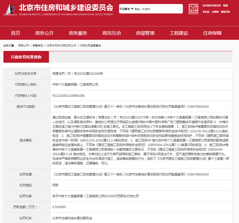 对此,北京住建委依据《北京市建设工程施工现场管理办法》第三十一条和《北京市住房城乡建设系统行政处罚裁量基准》C1667000A010,给予中铁十九局集团第一工程公司处5500元罚款的行政处罚。处罚决定书文号:京建法罚(市)字[2025]第010268号。