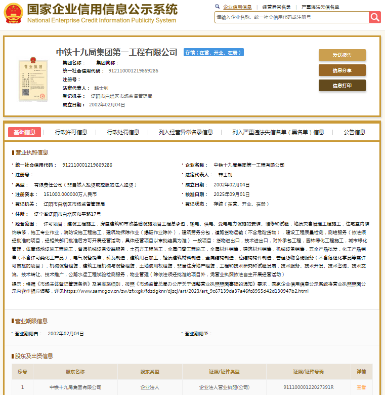 国家企业信用信息公示系统显示,中铁十九局集团第一工程有限公司成立于2002年,注册资本151000万元人民币,法定代表人为韩士钊,由中铁十九局集团有限公司全资持股。