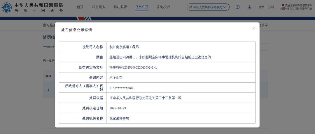 齐鲁晚报·齐鲁壹点记者于中国海事局监管信息公开栏获悉,10月23日,长江航道局旗下的长江南京航道工程局收张家港海事局罚单,处罚决定书文号:海事罚字[2025]06042030402-1-1。