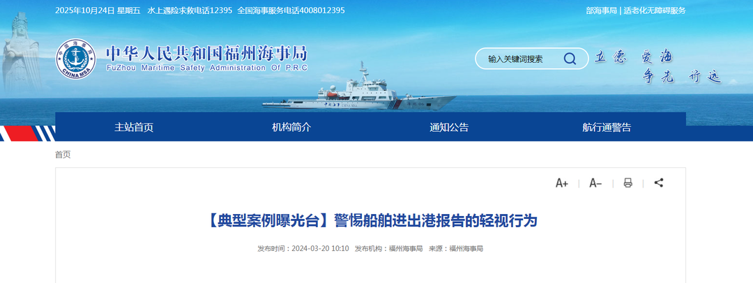 齐鲁晚报·齐鲁壹点记者于福州海事局“典型案例曝光台”一栏了解到,船舶进出港报告制度是海事管理机构掌握到港船舶动态,有效开展事中事后监管的重要手段,是精准统计分析我国航运客货数据的重要基础。需警惕船舶进出港报告的轻视行为。