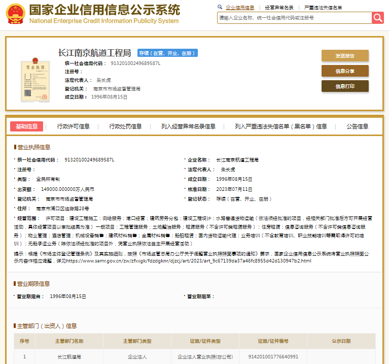 国家企业信用信息公示系统显示,长江南京航道工程局成立于1996年,注册资本149000万元人民币,法定代表人为朱长虎,由长江航道局全资持股。