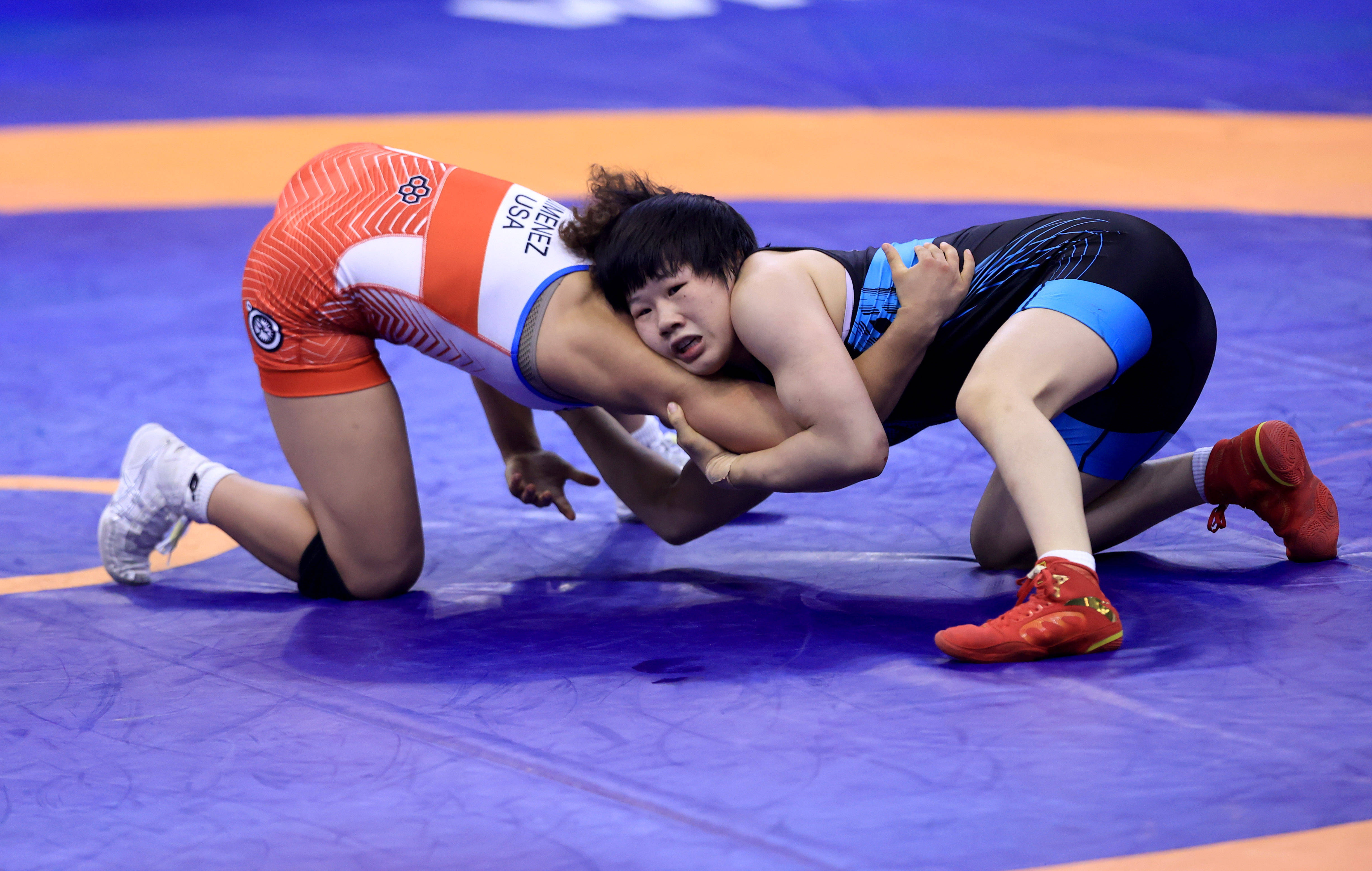 10月23日,中国选手梁锦月(上)和美国选手希门尼斯在比赛中。 新华社发(普雷德拉格·米洛萨夫列维奇摄)