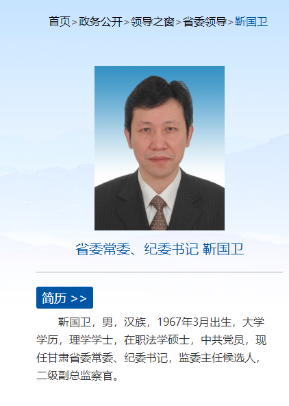 据甘肃省政府官网“省委领导”栏目资料,靳国卫已任甘肃省委常委、省纪委书记,监委主任候选人,二级副总监察官。