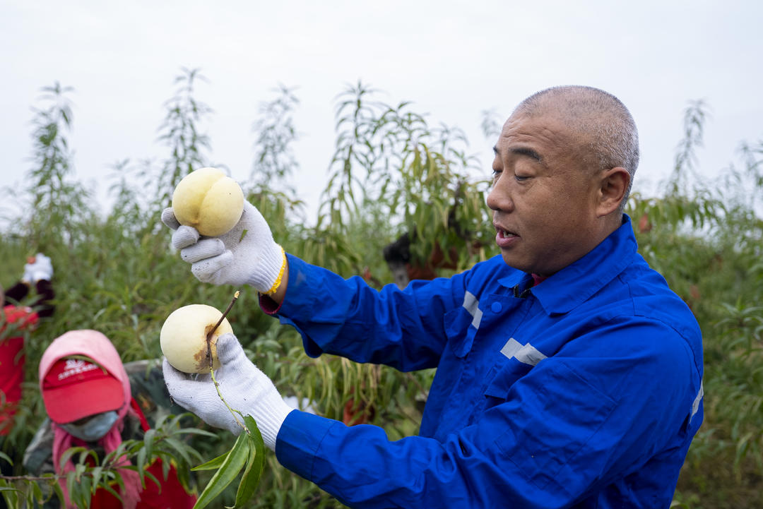 “不好意思,我们点位上现有的肽桃快卖光了,后面的顾客可能要稍等一会儿,我们正在抓紧补货。”“没关系,我们可以在这等,你们的桃子很新鲜,每年都会过来买。”随着新的补货运来,销售点位上开始各司其职。石桥肽桃备受欢迎,金黄个大、口感绝佳,每年10月下旬“抢鲜”上市,成为增收致富的“金果果”。刘凯每天关注桃子市场价格和线上销售情况,订单不断增加让他满心欢喜。他表示,中高端桃子销量渐长,得益于当地良好的水土。太白桃园于2015年流转1200余亩土地,引入云南丽江雪桃品种杂交培育,打造了适宜石桥肽桃生长的原生态环境。桃园依南阳湖而建,湿润空气造就冬暖夏凉的气候,独特的地理和气候环境赋予石桥肽桃脆、甜、香的品质和独特芳香。