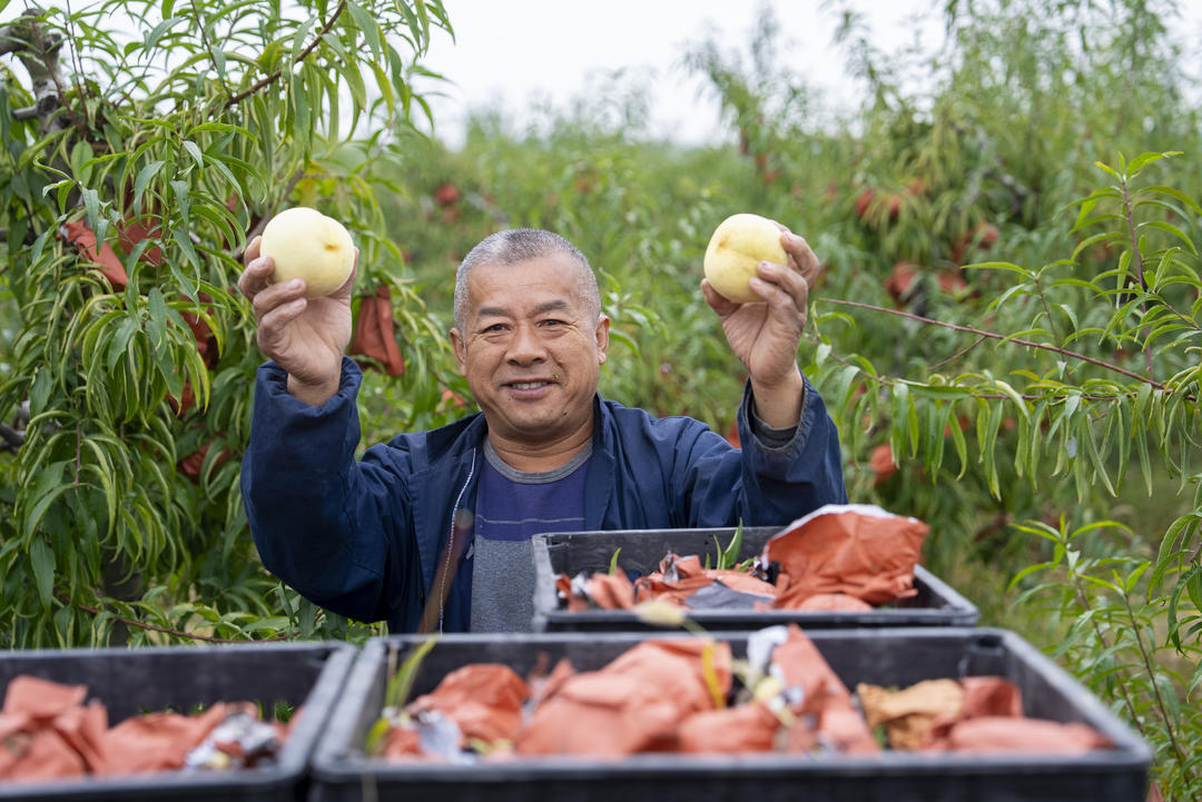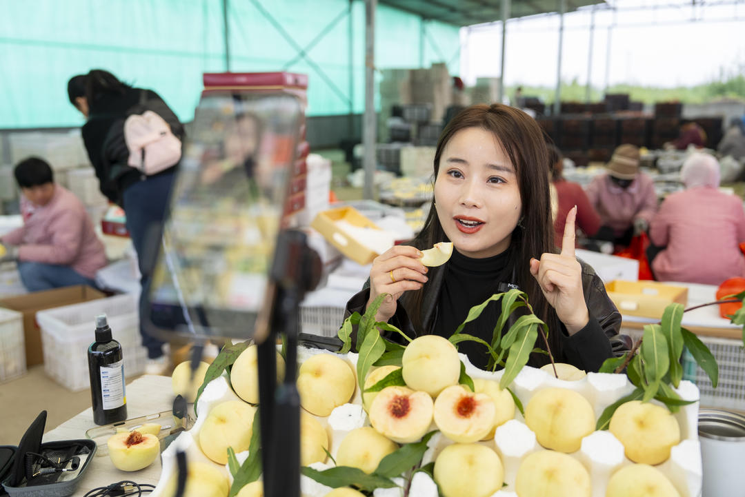 “这里的桃子很脆很甜,每一个都用纸袋保护着,宝子们看一看,您现在下单,工人现场采摘,24小时就能送到您家里了!”在桃园内的直播区域,带货主播顺手摘下一个桃子,撕开纸袋,用手擦了擦桃毛,没用水洗,就面对直播间的粉丝们吃了起来。事实上,今年太白桃园的石桥肽桃有着可喜的销量,已种植10年正值“壮年”的桃树,在这个秋天结出了品质上佳的果实,产量突破60万斤。