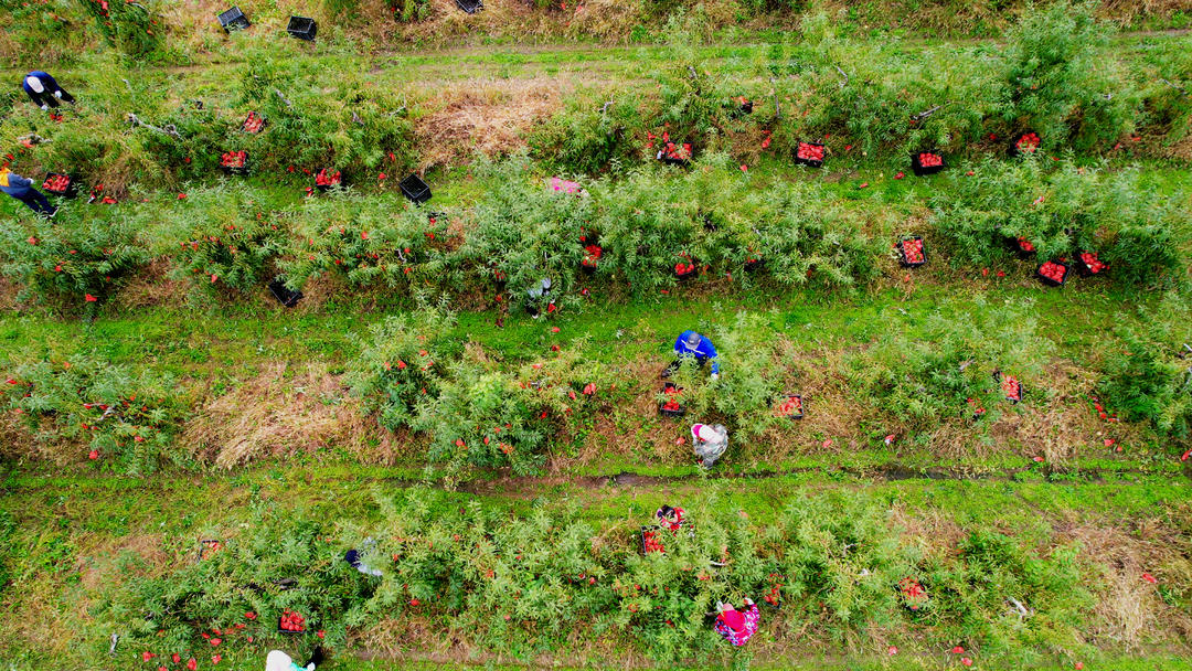“自10月23日开园以来,在线上线下都有销售,全国各地都有订单,每天销售2万多斤。”刘凯说,现在园区里60余名工人则正分散在桃林间忙碌着采摘、装筐、运输和打包,开足马力为当天运往省内外的订单备货。通过线上平台和社区团购,市场供不应求,部分优质肽桃还远销南方地区,让“石桥味道”走向更广阔的市场,今年石桥肽桃采摘期将持续到11月上旬。