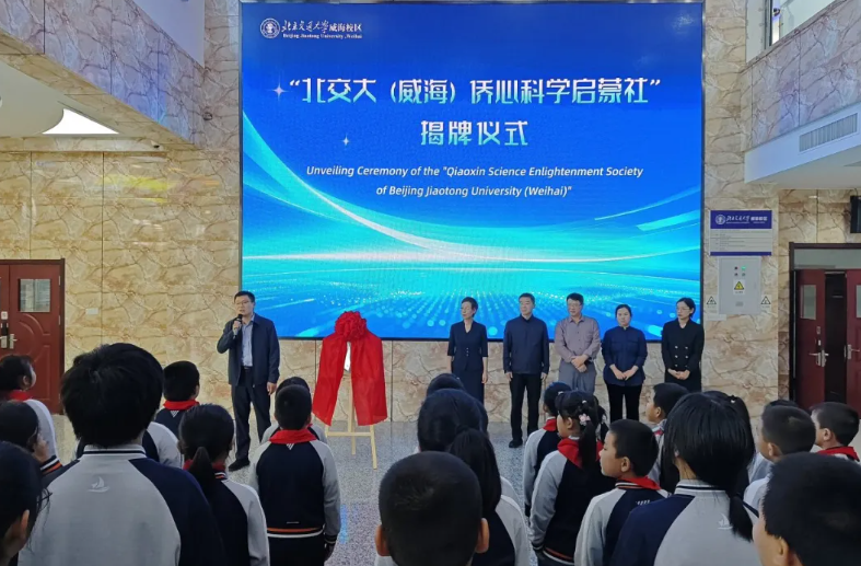 近日,威海市、区两级侨联与北京交通大学威海校区联合打造的改革创新项目,威海市首个高校侨务实体平台—北交大(威海)侨心科学启蒙社在威海校区举行揭牌仪式。威海校区党委书记李香山、威海市侨联副主席荣雪琳出席并共同为启蒙社揭牌。威海市侨联、文登区委统战部、区侨联及区侨心学校师生代表、威海校区教师代表等参加活动。