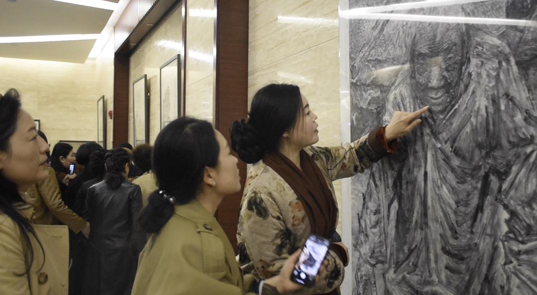 参观画展的来宾欣赏张立奎作品《沂蒙母亲》