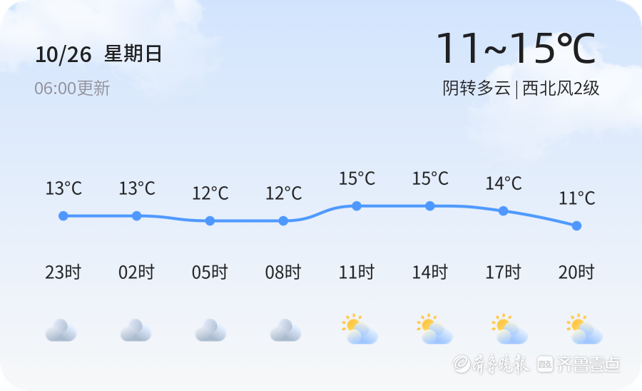 今天是10月26日,农历九月初六。青岛市今日天气阴转多云,气温介于11℃至15℃之间,西北风2级,相对湿度为100%。空气质量状况为良,PM2.5指数为72,适宜户外活动。今日阴天为主,建议市民出行时注意保暖,随身携带雨具以防不时之需。呼吸道敏感人群请注意防护。