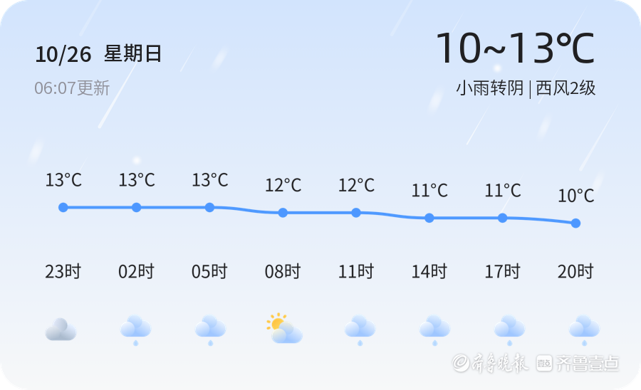 今天是10月26日,星期日,农历九月初六。威海市今天天气以小雨转阴为主,气温在13℃之间,西风2级,空气湿度71%,PM2.5指数为85。各区天气情况基本一致,均有小雨或阴天,风力较小,适合市民出行。