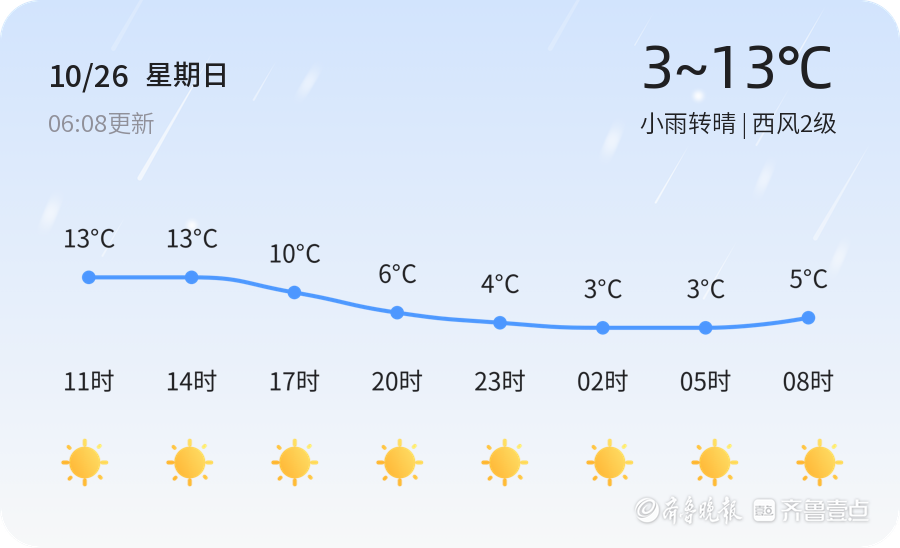 今日是2025年10月26日,农历九月初六,星期日。滨州地区今日天气为小雨转晴,气温范围在3℃至13℃之间。目前实时温度为10.6℃,湿度较高,达到89%,风力较小,为西风2级。空气质量方面,PM2.5指数为94,属于良好水平,适合户外活动。