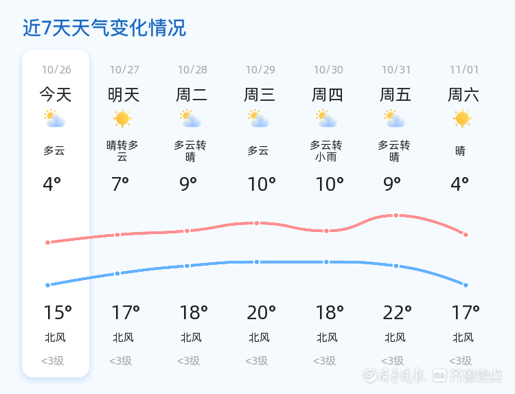今天是10月26日,星期日,农历九月初六。菏泽市今日天气多云,气温在4℃至15℃之间,南风1级,空气湿度94%,PM2.5指数84。全市各区天气情况总体平稳,以多云为主,风力较小,适合市民出行和户外活动。