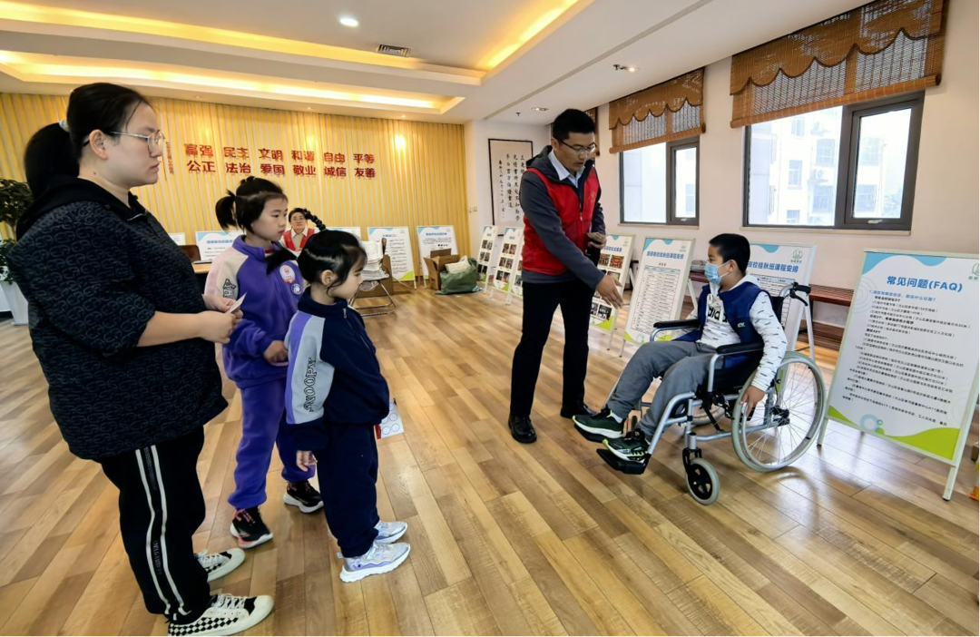 大家最喜爱的还是互动体验与打卡环节,“预防小能手”医学宣教区、筛查体验区、急救模拟区、知识问答区让各年龄段的读者都学到了对自己有益的疾病预防知识,提升了急救能力。“无障碍体验日”打卡中,大家佩戴眼罩模拟视力障碍,体验盲道行走;使用轮椅或拐杖模拟肢体障碍,体验行走及按、乘坐电梯的不适;绑住单侧手臂模拟肢体障碍,尝试“单手翻书”;使用耳机模拟听力障碍,感受无声世界里的不便与挑战。最后,体验者们庄严签下“预防承诺”贴到“承诺墙”上,表达自己以实际行动预防残疾的决心。